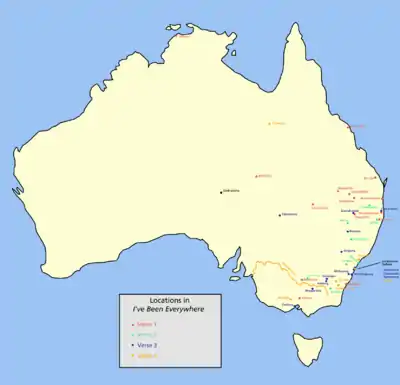 Australian Peter Harris visited all the locations in the Australian version of "I've Been Everywhere" between December 2009 and July 2011. A record of his trip is located here.[14]