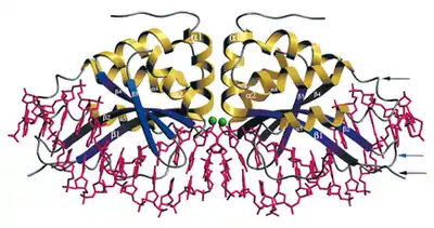 In order to use I-CreI as a tool in this fashion, it is necessary to make it recognize and cleave sequences of DNA different from its native homing site. An Escherichia coli genetic system for studying the relationship between I-CreI structure and its homing site specificity was created in 1997.[5] In 1997, the structure of the I-CreI protein was determined,[6] and in 1998, its crystal structure bound to its native DNA homing site was solved, greatly aiding research in altering the homing site recognition of the protein.[4] Mutant forms of the protein have since been created that exhibit altered homing site specificity.[7][8][9] A genetic system in Saccharomyces cerevisiae has also been created, yielding additional I-CreI mutants with modified homing site specificities.[10][11]
