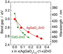 Similarly to CuGaO2, α-AgGaO2 and α-AgAlO2 have the delafossite crystal structure while the structure of the corresponding β phases is similar to wurtzite (space group Pna2a). β-AgGaO2 is metastable and can be synthesized by ion exchange with a β-NaGaO2 precursor. The bandgaps of β-AgGaO2 and β-AgAlO2 (2.2 and 2.8 eV respectively) are indirect; they fall into the visible range and can be tuned by alloying with ZnO. For this reason, both materials are hardly suitable for solar cells, but have potential applications in photocatalysis.[2]