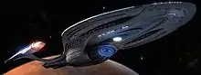 One version of USS Enterprise (NCC-1701-F) appears in the massively multiplayer online role-playing game Star Trek Online. Its design is based on the entry submitted by Adam Ihle for the 2011 "Design the next Enterprise" contest, a joint venture between Cryptic Studios, CBS, and Intel, which ran shortly before the game went "free to play". Enterprise-F made its first appearance in the mission "Boldly They Rode", at the point where USS Enterprise-F appears to help the player defeat the Dominion fleet surrounding Deep Space Nine. In 2018, the in-game appearance of the ship was changed to that of a "Yorktown Class" vessel, after the ship was damaged and refit as part of the game's story.[15] The original, Odyssey class version of the ship would later appear in Season 3 of Star Trek: Picard in February 2023, making the Enterprise-F part of the official Star Trek canon.[16][17]