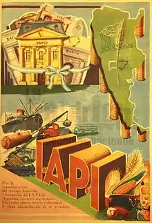 The Argentine Institute for the Promotion of Trade (IAPI) was an Argentine public body created by the decree nº 15350 on May 28, 1946, that, although it was signed by President Edelmiro Farrell, it was part of the package that Colonel Juan Domingo Perón and his team of advisers had projected, operating under the aegis of the Central Bank, in order to centralize foreign trade and transfer resources between different sectors of the economy. Its director was the economist Miguel Miranda, chairman of the Central Bank.