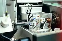 Before mass separation, a beam of positive ions has to be extracted from the plasma and focused into the mass-analyzer. It is important to separate the ions from UV photons, energetic neutrals and from any solid particles that may have been carried into the instrument from the ICP. Traditionally, ICP-MS instruments have used transmitting ion lens arrangements for this purpose. Examples include the Einzel lens, the Barrel lens, Agilent's Omega Lens[19] and Perkin-Elmer's Shadow Stop.[20] Another approach is to use ion guides (quadrupoles, hexapoles, or octopoles) to guide the ions into mass analyzer along a path away from the trajectory of photons or neutral particles. Yet another approach is Varian patented used by Analytik Jena ICP-MS[21] 90 degrees reflecting parabolic "Ion Mirror" optics, which are claimed to provide more efficient ion transport into the mass-analyzer, resulting in better sensitivity and reduced background. Analytik Jena ICP-MS PQMS is the most sensitive instrument on the market.[22][23][24]