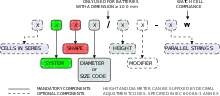 | Designation | Series Cells | System | Shape | Standardized code or diameter code | Diameter modifier | Height code | Height adjustment modifier | Modifier(s) | Parallel strings | Remarks |