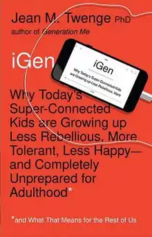iGen[lower-alpha 1] is a 2017 nonfiction book by Jean Twenge that studies the lifestyles, habits and values of Americans born 1995–2012,[1] the first generation to reach adolescence after smartphones became widespread. Twenge refers to this generation as the "iGeneration" (also known as Generation Z). Although she argues there are some positive trends, she expresses concern that the generation is being isolated by technology.