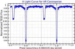 AR Cassiopeiae (AR Cas) is a variable star in the constellation of Cassiopeia. It is thought to be a member of a septuple star system, one of only two known star systems with a multiplicity of 7, the other being Nu Scorpii.[12][9]