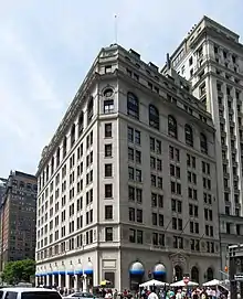 Kendall designed additional stories to the Washington Building in 1885,[44] but sources disagree as to how this was undertaken. According to Fran Leadon, a two-story addition was built shortly after the Washington Building's completion, and another two-story expansion was added in 1886–1887.[4] However, Christopher Gray of The New York Times mentions a single 4-story addition that was completed by 1887.[11] Either way, following the expansion, the top story consisted of a mansard roof containing protruding dormers on its south face.[12] After the expansions, the building was 258 feet (79 m) tall.[4][11] Gray and a contemporary Real Estate Record article characterized the Washington Building as being 14 stories,[11][44] but Moses King's 1893 Handbook of New York City and an 1896 Times article described the building as being 13 stories.[21][29][lower-alpha 6] The Washington Building Company hired Harry E. Donnell in 1908 to perform unspecified "internal improvements" on the structure.[45]