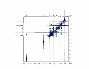 1H COSY spectrum of progesterone. The spectrum that appears along both the horizontal and vertical axes is a regular one dimensional 1H NMR spectrum. The bulk of the peaks appear along the diagonal, while cross-peaks appear symmetrically above and below the diagonal.