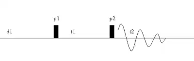 The first and most popular two-dimension NMR experiment is the homonuclear correlation spectroscopy (COSY) sequence, which is used to identify spins which are coupled to each other. It consists of a single RF pulse (p1) followed by the specific evolution time (t1) followed by a second pulse (p2) followed by a measurement period (t2).[6]