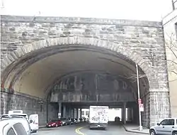 The Concourse Line runs north to south through the Bronx and portions of Harlem, parallel to the mostly-elevated IRT Jerome Avenue Line which lies between two and four blocks to the west for its entire length in the Bronx.[5] Due to the steep topography of the neighborhoods surrounding the Grand Concourse (under which most of the line runs), several stations were built with entrances both above and below the platforms, including 167th Street and Kingsbridge Road. Because the line also connected with Yankee Stadium at 161st Street and with the former Polo Grounds at 155th Street, there were also several switches and a storage track to accommodate additional trains during game days.[6]