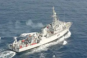 INS Kozhikode (M71) was a minesweeper of the Karwar class, of similar design to the Pondicherry-class ships that were in service with the Indian Navy till 2012. Built by the Sredne-Nevskiy Shipyard at Saint Petersburg, Russia. Except for the addition of surface-to-air missiles.[2][3] Kozhikode is a modified Natya-class minesweeper. The ship took part in the International Fleet Review 2016 that was held off the coast of Visakhapatnam.[4]