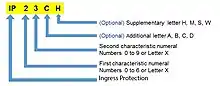Code lettersFirst characteristic numeral: Solid particle protectionSecond digit: Liquid ingress protectionThird digit: Mechanical impact resistanceAdditional letter: Other protectionsSupplementary letter: Other protections