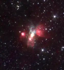 IRAS 18162-2048 is a far-infrared source discovered by IRAS spacecraft in 1983. It is associated with a massive (~10 solar masses) protostar, which accretes gas from a disk that surrounds it. IRAS 18162-2048 emits two collimated radio jets along its axis of rotation. The jets are made of chains of radio sources aligned in a southwest-northeast direction. The northern jet terminates in Herbig–Haro object HH 81N, while the southern one terminates in Herbig–Haro objects HH 80 and HH 81. The total luminosity of IRAS 18162-2048 is about 17,000 solar luminosities. The total extent of this system of jets and radio sources is about 5 pc.[2]