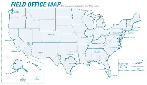 IRS-CI operates 21 field offices in the United States located in Atlanta, Boston, Charlotte, Chicago, Cincinnati, Dallas, Denver, Detroit, Houston, Las Vegas, Los Angeles, Miami, Newark, New York, Oakland, Philadelphia, Phoenix, Seattle, St. Louis, Tampa and Washington D.C. (IRS-CI headquarters). Many of these offices are further subdivided into smaller resident agencies which have jurisdiction over a specific area. These resident agencies are considered to be part of the primary field offices. IRS-CI headquarters, located in Washington, D.C., controls the flow of the agents and support staff that work out of the field offices across the country. Each field office is overseen by a Special Agent in Charge (SAC) and assisted by one (or more) Assistant Special Agent in Charge.[11] In addition to the field offices in the United States, IRS-CI, through its Office of International Operations (IO), has special agent attachés stationed in 11 foreign countries: Australia, Barbados, Canada, China, Colombia, England, Germany, Mexico, Panama, The Netherlands (Europol) and United Arab Emirates.