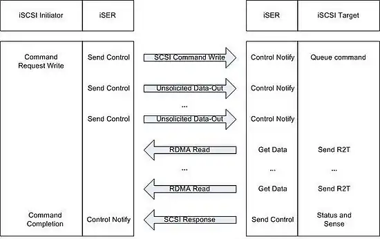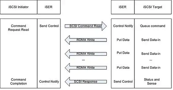 The main difference between the standard iSCSI and iSCSI over iSER is the execution of SCSI read/write commands. With iSER the target drives all data transfer (with the exception of iSCSI unsolicited data) by issuing RDMA write/read operations, respectively. When the iSCSI layer issues an iSCSI command PDU, it calls the Send_Control primitive, which is part of the DI. The Send_Control primitive sends the STag with the PDU. The iSER layer in the target side notifies the target that the PDU was received with the Control_Notify primitive (which is part of the DI). The target calls the Put_Data or Get_Data primitives (which are part of the DI) to perform an RDMA write/read operation respectively. Then, the target calls the Send_Control primitive to send a response to the initiator. An example is shown in the figures (time progresses from top to bottom).