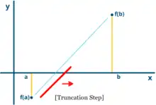 The ITP method follows the same structure of standard bracketing strategies that keeps track of upper and lower bounds for the location of the root; but it also keeps track of the region where worst-case performance is kept upper-bounded. As a bracketing strategy, in each iteration the ITP queries the value of the function on one point and discards the part of the interval between two points where the function value shares the same sign. The queried point is calculated with three steps: it interpolates finding the regula falsi estimate, then it perturbes/truncates the estimate (similar to Regula falsi § Improvements in regula falsi) and then projects the perturbed estimate onto an interval in the neighbourhood of the bisection midpoint. The neighbourhood around the bisection point is calculated in each iteration in order to guarantee minmax optimality (Theorem 2.1 of [3]). The method depends on three hyper-parameters and where is the golden ratio : the first two control the size of the truncation and the third is a slack variable that controls the size of the interval for the projection step.[lower-alpha 1]