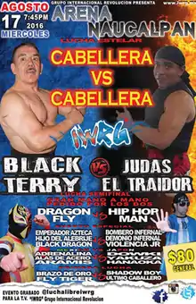For the August 2016 Caballera vs. Caballera event IWRG main stay Black Terry and independent circuit wrestler Judas el Traidor both "bet" their hair on the outcome of the match. Black Terry won the match, two falls to one. forcing Judas el Traidor to have all his hair shaved off in the middle of the ring. In the semi-main event Dragón Fly defeated Hip Hop Man and then challenged him to defend the Catch Argentino International Championship at a later date. The show included three additional matches.