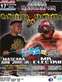 The IWRG Cabellera vs. Cabellera (July 2016) show (Spanish for "hair versus hair") was a professional wrestling supercard event produced by Mexican professional wrestling promotion International Wrestling Revolution Group (IWRG), and took place on July 17, 2016 in Arena Naucalpan, Naucalpan, State of Mexico, Mexico. The focal point of the Caballera vs. Caballera series of shows is one or more traditional Lucha de Apuestas, or "Bet matches", where all competitors in the match risk their hair on the outcome of the match. The Lucha de Apuestas is considered the most prestigious match type in lucha libre, especially when a wrestlers mask is on the line, but the "hair vs. hair" stipulation is held in almost as high regard.