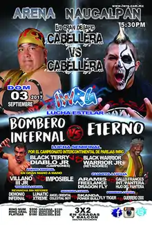 For the September 2017 Cabellera vs. Cabellera event IWRG veteran Bombero Infernal faced off against Eterno. Eterno defeated the veteran Bombero Infernal, forcing him to have all his hair shaved off as a result. In the semi-main event match the father/son team Los Warriors (Black Warrior and Warrior Jr. defeated Black Terry and Diablo Jr. to win the IWRG Intercontinental Tag Team Championship for the first time. The show included five additional matches