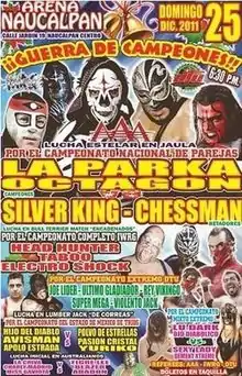 The Mexican National Tag Team Championship was established in 1957, making it one of the earliest examples of a tag team championship.[11][12] Over the years the championship was primarily promoted by Empresa Mexicana de Lucha Libre ("Mexican Wrestling Enterprise"; EMLL) and held by famous teams such as Los Hermanos Shadow (Blue Demon and Black Shadow), Los Rebeldes ("The Rebels"; Rene Guajardo and Karloff Lagarde), Rayo de Jalisco and El Santo and La Ola Blanca (Dr. Wagner and Ángel Blanco).[11][12] In 1993 then champions Los Destructores (Tony Arce and Rocco Valente) left EMLL to join AAA, bringing with them the Mexican National Tag Team Championship. From that point on it was promoted almost exclusively by AAA.[11][12] Around 2007 AAA stopped promotion the Mexican National Tag Team Championship and introduced the AAA World Tag Team Championship, at which point the Mexican championship became inactive.[13] Champions La Parka and Octagón revealed that they still had the championship belts in 2011, with IWRG deciding to make the return of the championship the main event of their Guerra de Campeones interpromotional show.[1]
