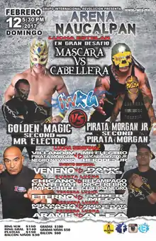 The IWRG Máscara vs. Cabellera (February 2017) (Spanish for "Mask vs. Hair") show was a major lucha libre event produced and scripted by Mexican professional wrestling promotion International Wrestling Revolution Group (IWRG), that took place on February 12, 2017in Arena Naucalpan, Naucalpan, State of Mexico, Mexico. The focal point of the Máscara vs. Caballera series of shows is one or more traditional Lucha de Apuestas, or "Bet matches", where all competitors in the match risk their hair on the outcome of the match. The Lucha de Apuestas is considered the most prestigious match type in lucha libre, especially when a wrestlers mask is on the line, but the "hair vs. hair" stipulation is held in almost as high regard.