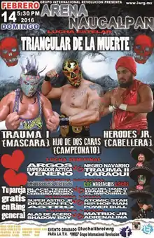 The Mexican wrestling promotion International Wrestling Revolution Group (IWRG; Sometimes referred to as Grupo Internacional Revolución in Spanish) has Triangular de la Muerte (Spanish for "Triangle of Death") matches on several occasions since its creation in 1997. Traditionally Luchas de Apuestas ("bet matches") are contested as either singles or tag team matches,[2] but IWRG has used a hybrid version featuring three wrestlers or three teams all "betting" something on the match.[3] In another deviation from tradition IWRG often chooses to have one participant risk their championship instead of their mask or their hair.[2][3] Their only Triangular de la Muerte show in 2016 was held on February 14, 2016 in Arena Naucalpan, Naucalpan, State of Mexico where IWRG holds almost all of their major lucha libre shows.[1]