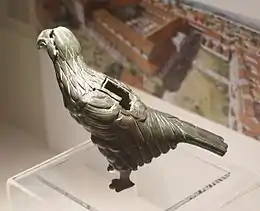 Several inscriptions attesting IX Hispana have been found in the site of the legionary fortress on the lower Rhine river at Noviomagus Batavorum (Nijmegen, Netherlands). These include some tile-stamps (dated 104–120); and a silver-plated bronze pendant, found in the 1990s, that was part of a phalera (military medal), with "LEG HISP IX" inscribed on the reverse.[9] In addition, an altar to Apollo, dating from this period, was found at nearby Aquae Granni (Aachen, Germany), erected in fulfillment of a vow, by Lucius Latinius Macer, who describes himself as primus pilus (chief centurion) and as praefectus castrorum ("prefect of the camp", i.e. third-in-command) of IX Hispana.[10] (it was commonplace for chief centurions, on completion of their single-year term of office, to be promoted to praefectus castrorum).