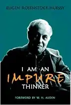 I Am an Impure Thinker is a book by Eugen Rosenstock-Huessy (1888-1973), German social philosopher and is an English-language introduction to Rosenstock-Huessy’s German-language book, Soziologie. It is a collection of essays, which represents an accessible introduction to Rosenstock-Huessy’s thought. The "impure thinker" title reflects the author’s escape from the bounds set by academic tradition, his belief that thought must be accompanied by passionate convictions and engagement, and that sterile intellect is a disease. While apparently unrelated, the essays nevertheless have an underlying unity, which runs through his discussion of the concepts of William James, the Gospels, the Egyptian symbol of Ka, and other uncommon sources. Together the essays contribute to the discovery of a post-theological language. They answer Dietrich Bonhoeffer’s question: “How can we speak of God to modern man who ‘has come of age?’”[1] It has been recognized as a summary of Rosenstock-Huessy's insights into Western culture by such thinkers as W. H. Auden, Dietrich Bonhoeffer, Martin E. Marty, and Harold J. Berman.