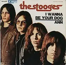 "I Wanna Be Your Dog" is a song by American rock band the Stooges, released as the group's debut single from the band's 1969 self-titled debut album. The riff is composed of only three chords (G, F♯ and E), is played continuously throughout the song (excepting two brief 4-bar bridges). The 3-minute-and-9-second-long song, with its distortion-heavy guitar intro, single-note piano riff played by producer John Cale of the Velvet Underground, and steady, driving beat, gave the cutting edge of the early heavy metal and punk sound.[4]