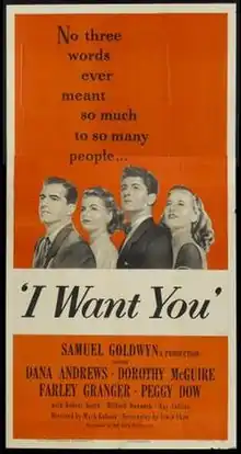 I Want You is a 1951 film directed by Mark Robson taking place in America during the Korean War.[2] Gordon E. Sawyer was nominated for the Academy Award for Best Sound.[3][4][5]