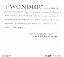 "I Wonder" is a piano ballad with steel guitar fills, that describes the personal experiences of Pickler's childhood, in which her mother was absent.