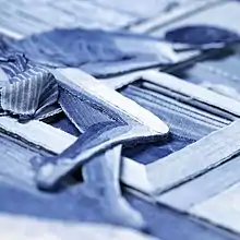 His process involves cutting, stitching, and gluing various shades of denim to provide contrast and shadow.[15][25][26][27] Even at touching distance, many viewers don't realise that they are looking at many layers, and shades, of denim jeans.[28] Many people compare it to Photorealism, but just with denim, not paint,[29][30][31][32][33] 'your first impression is that of an indigo coloured oil painting, or a photograph in blue.'[33][34][10]