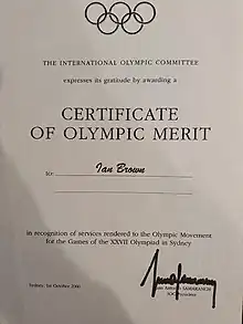 Late in 2000 Brown was Awarded an International Olympic Committee Certificate of Merit for his efforts.