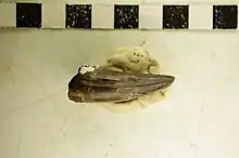 The mandible specimen was found in the "Lutetian" fossil site of Issel in France.[3] It has a symphysis that has a spoon-like shape that reaches the 8th alveoli and is the thickest in with at the 4th tooth, the splenial is one-half the length of the symphysis.[3] The dentary has light started ornamentations and vermiculation, there are a row of vascular foramen that open backwards on the upper part of the dentary, and the lower half has longitudinal depressions on the lateral.[3] There is a surface full of wrinkles on the lateral dorsal side, for muscle attachment to surangular.[3]