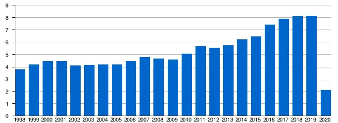 In 2011, the airport provisionally handled over 5.6 million passengers and around 61,000 aircraft movements, an increase of 11.9% and 8.4% respectively compared with 2010.[1]