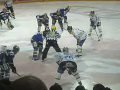 ![]() Esa Pirnes (Blues) and Michal Bros (Kärpät) in the faceoff circle during a decisive Liiga playoff game on 1 April 2006. | |