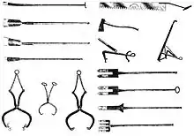 The process required a range of equipment. Some of this was protective equipment to allow the workforce and horses to operate safely on ice, including cork shoes for the men and spiked horse shoes.[153] Early in the 19th century only ad hoc, improvised tools such as pickaxes and chisels were used for the rest of the harvest, but in the 1840s Wyeth introduced various new designs to allow for a larger-scale, more commercial harvesting process.[163] These included a horse-drawn ice cutter, resembling a plough with two parallel cutters to help in marking out the ice quickly and uniformly, and later a horse-drawn plough with teeth to assist in the cutting process itself, replacing the hand saw.[164] By the 1850s, specialist ice tool manufacturers were producing catalogues and selling products along the east coast.[165] There were discussions over the desirability of a circular cutting saw for much of the 19th century, but it proved impractical to power them with horses and they were not introduced to ice harvesting until the start of the 20th century, when gasoline engines became available.[141]