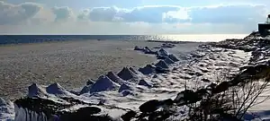 An ice volcano is a conical mound of ice formed over a terrestrial lake via the eruption of water and slush through an ice shelf. The process is wave-driven, with wind providing the energy for the waves to cut through the ice and create formations that loosely mimic the shape and activity of volcanoes.[1] After being ejected into the atmosphere, the liquid water and slush freeze and fall back to the surface, growing the formation. Ice may also be erupted. The phenomenon is most often observed along the southern coast of Lake Erie and Lake Ontario, when the temperature is below freezing and the wind blows onshore with a velocity of at least 25 mph (40 km/h). They are known to reduce coastal erosion there. The formations are temporary: they are frequently destroyed by storms and warm weather, and once the lake wholly freezes over, eruptions are no longer possible.[2]