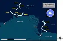 In summer 2003 C-19 moved northward very rapidly, passed Cape Adare, and broke in two pieces: C-19A and C-19B.