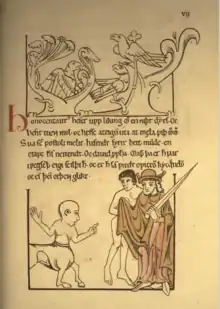 The Icelandic Physiologus is a translation into Old Icelandic of a Latin translation of the 2nd-century Greek Physiologus. It survives in fragmentary form in two manuscripts, both dating from around 1200, making them the earliest illustrated manuscripts from Iceland and among the earliest Icelandic manuscripts generally.[1] The fragments are significantly different from each other and either represent copies from two separate exemplars or different reworkings of the same text.[2] Both texts also contain material that is not found in standard versions of the Physiologus.[2]