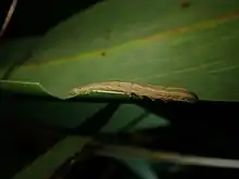 About 1+1⁄2 inches in length, of almost uniform thickness, considerably flattened; the head is ochreous, the body very pale ochreous-brown; there are no distinct markings on the thoracic segments, except a few minute black dots round the middle of each; the rest of the body is covered with a number of very fine blackish lines, which become darker posteriorly, and are stronger on the dorsal and lateral regions; there is a row of minute black dots round the middle of each segment; the spiracles are black and the underside of the larva is faintly tinged with green.[5]