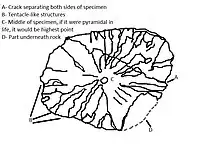 Ichnusa cocozzi is described as a hemispherical or pyramidal scyphozoan that inhabited the Ediacaran period.[3] Three individuals of I. cocozzi have been described: one holotype and two paratypes.[2] None of the individuals preserve their internal organs, and the holotype is the only one to preserve tentacles. The holotype has a diameter of 27.6 mm x 20 mm.[1] The tentacles preserved in the holotype are 1.2 mm long, and between 0.25 and 0.5 mm wide.[1] This scyphozoan had four radial lobes that come out of a center that doesn’t have any structure preserved. These lobes subdivide into 2, and then into 4 more smaller lobes. It is difficult to know if the organism had a gastrovascular system of four or eight first-order lobes. Ichnusa cocozzi was a marine organism[4]