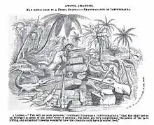 The discovery of a hitherto unsuspected extinct group of large marine reptiles generated much publicity, capturing the imagination of both scientists and the public at large. People were fascinated by the strange build of the animals, especially the large scleral rings in the eye sockets,[19] of which it was sometimes erroneously assumed these would have been visible on the living animal. Their bizarre form induced a feeling of alienation, allowing people to realise the immense span of time passed since the era in which the ichthyosaur swam the oceans.[20] Not all were convinced that ichthyosaurs had gone extinct: Reverend George Young found a skeleton in 1819 at Whitby; in his 1821 description, he expressed the hope that living specimens could still be found.[21] Geologist Charles Lyell to the contrary, assumed that the Earth was eternal so that in the course of time the ichthyosaur might likely reappear, a possibility lampooned in a famous caricature by De la Beche.