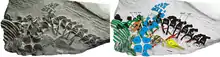 During the nineteenth century, the number of described ichthyosaur genera gradually increased. New finds allowed for a better understanding of their anatomy. Owen had noted that many fossils showed a downward bend in the rear tail. At first, he explained this as a post mortem effect, a tendon pulling the tail end downwards after death. However, after an article on the subject by Philip Grey Egerton,[25] Owen considered the possibility that the oblique section could have supported the lower lobe of a tail fin.[26] This hypothesis was confirmed by new finds from Germany. In the Posidonia Shale at Holzmaden, dating from the early Jurassic, already in the early nineteenth century, the first ichthyosaur skeletons had been found.[27][28][29] During the latter half of the century, the rate of discovery quickly increased to a few hundred each year. Ultimately, over four thousand were uncovered, forming the bulk of ichthyosaur specimens displayed today. The sites were also a Konservat-Lagerstätte, meaning not only the quantity, but also the quality was exceptional. The skeletons were very complete and often preserved soft tissues, including tail and dorsal fins. Additionally, female individuals were discovered with embryos.[30]