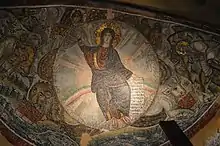 When Theodora's pagan mother was informed of the icon by Theodora's servants, Theodora had the entire apse and icon quickly covered with plaster to preserve the image and to hide it from her parents.[13][1][4] After Theodora's father returned from battle, he learned of her conversion to Christianity and arrested her, locking her in a tower prison.[1][13] Refusing to sacrifice to idols, she died as a martyr in 305.[13]