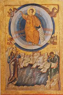 The most generally agreed upon interpretation is that the icon depicts the apocalyptic scene of Christ's Second Coming.[1] This is supported by the story of the monk Sennuphius who is said to have asked God through prayer to see this Second Coming. In turn, Sennuphius found the icon, which led Abbott Ignatius to interpret it as an apocalyptic scene.