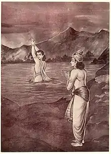 In the Matsya Purana, Ila was disinherited after becoming a female or kimpurusha. Ila's father passed his inheritance directly to Pururavas, ignoring the three sons Ila-Sudyumma bore as a male. Pururavas ruled from Pratishtanapura (present-day Allahabad), where Ila stayed with him.[9][22] The Ramayana says that having returned to manhood, Ila ruled Pratishtana while his son Shashabindu ruled over Bahlika.[14] The Devi-Bhagavata Purana tells that as a man Sudyumma governed the kingdom and as a woman remained indoors. His subjects were disturbed by his sex changes and did not respect him as they once had. When Pururavas attained adulthood, Sudyumma left his kingdom to Pururavas and went to the forest for penance. The sage Narada told Sudyumma a nine-syllable mantra, Navakshara, which would please the Supreme Goddess. Pleased with his austerities, the Goddess emerged before Sudyumma, who was in his female form Ilā. Sudyumma praised the Goddess, who merged the king's soul with herself and thus, Ilā gained salvation.[3]
