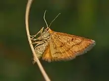 Idaea flaveolaria has a wingspan of 12–14 millimetres (0.47–0.55 in) in females and 14–18 millimetres (0.55–0.71 in) in males. The basic color of the wings is bright brown orange. On the forewings and hindwings there are two brown transversal lines, often almost indistinct. These transversal lines appear more clearly on the underside of the wings, together with a dark discal spots. The edge of the wings shows a blackish fringe.[3]