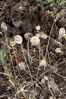 Idahoa is a monotypic genus of plants in the family Brassicaceae containing the single species Idahoa scapigera, which is known by the common names scalepod and oldstem idahoa. It is native to western North America from British Columbia to California to Montana where it grows generally in mountains and foothills. This is a petite annual herb growing a basal rosette of petioled leaves each one to three centimeters long and smooth or lobed along the edges. The thin, leafless erect stems rise to a maximum height near ten centimeters. Each bears a single tiny flower with white petals above red-purple sepals. The fruit is a flat, round capsule, shaped like a disc or somewhat oval, and 6 to 12 millimeters wide. The green fruit dries to a papery gray or white.