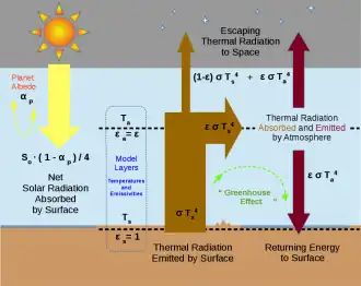Essential features of this model where first published by Svante Arrhenius in 1896.[2] It has since become a common introductory "textbook model" of the radiative heat transfer physics underlying Earth's energy balance and the greenhouse effect.[3][4][5] The planet is idealized by the model as being functionally layered, but dimensionless (i.e. a zero-dimensional model) with regard to its mathematical space.[6] The layers include a surface with constant temperature Ts and an atmospheric layer with constant temperature Ta. For diagrammatic clarity, a gap can be depicted between the atmosphere and the surface. Alternatively, Ts could be interpreted as a temperature representative of the surface and the lower atmosphere, and Ta could be interpreted as the temperature of the upper atmosphere, also called the skin temperature. In order to justify that Ta and Ts remain constant over the planet, strong oceanic and atmospheric currents can be imagined to provide plentiful lateral mixing. Furthermore, the temperatures are understood to be multi-decadal averages such that any daily or seasonal cycles are insignificant.