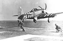 Invasion stripes were re-introduced on British and Australian Fleet Air Arm aircraft operating during the Korean War in 1950. Similar stripes were also used early in the war on F-86 Sabres of the 4th Fighter Interceptor Wing as a deviation from the standard yellow stripes.